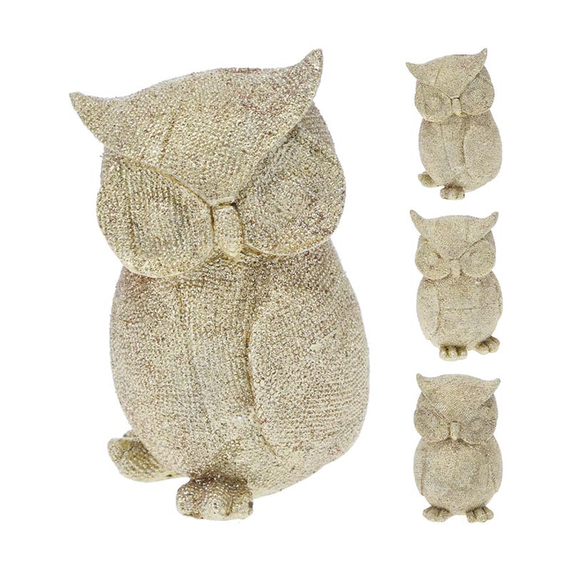 Popis k výrobku: Figurka sedící sovy 12 cm, zlatá, třpytivá (3 vzory)