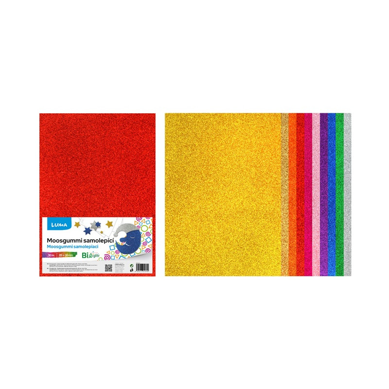 Popis k výrobku: Samolepicí pěnovka MOOSGUMMI A4 - mix BIO GLITR / 10ks samolepící pěnová guma s bio rozložitelnými glitrem, moosgummi, měkká a poddajná, glitrové barvy - mix barev, vhodná na výrobu razítek, zvířátek, masek i při tvorbě nejrůznějších stálebarevných a voděodolných dekorací, rozměr: A4 - 20 x 30cm, tloušťka: 2mm