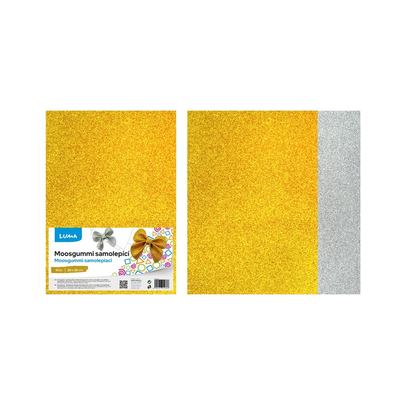 samolepící pěnová guma s glitry, moosgummi, měkká a poddajná, glitrové barvy - zlatá a stříbrná, vhodná na výrobu razítek, zvířátek, masek i při tvorbě nejrůznějších stálebarevných a voděodolných dekorací, rozměr: A4 - 20 x 30cm, tloušťka: 2mm