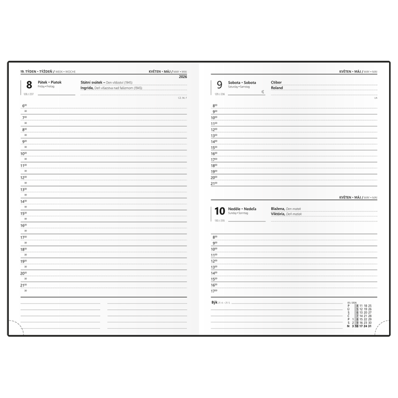 povrch diáře příjemný na dotek, zářivé barvy, moderní design, české a slovenské jmenné kalendárium, dny a měsíce v 5 jazycích (CZ, SK, ANG, D, R), mezinárodní svátky, měsíční fáze, roční období, letní a zimní čas, místo na poznámky, formát 14,3 x 20,5 cm