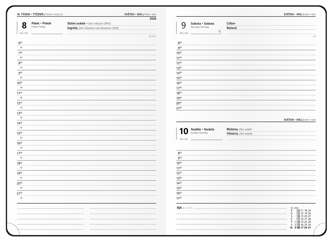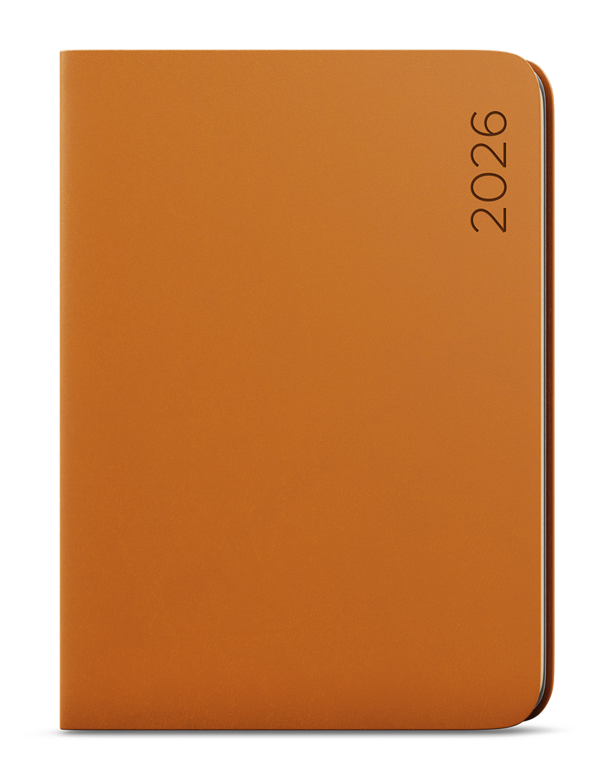jemný materiál (imitace semiše), jednostranná výplň desek, ražba roku, rovný hřbet, zakulacené rohy, české a slovenské jmenné kalendárium, dny a měsíce v 5 jazycích (CZ, SK, ANG, D, R), mezinárodní svátky, měsíční fáze, roční období, letní a zimní čas, místo na poznámky, formát 14,3 x 20,5 cm