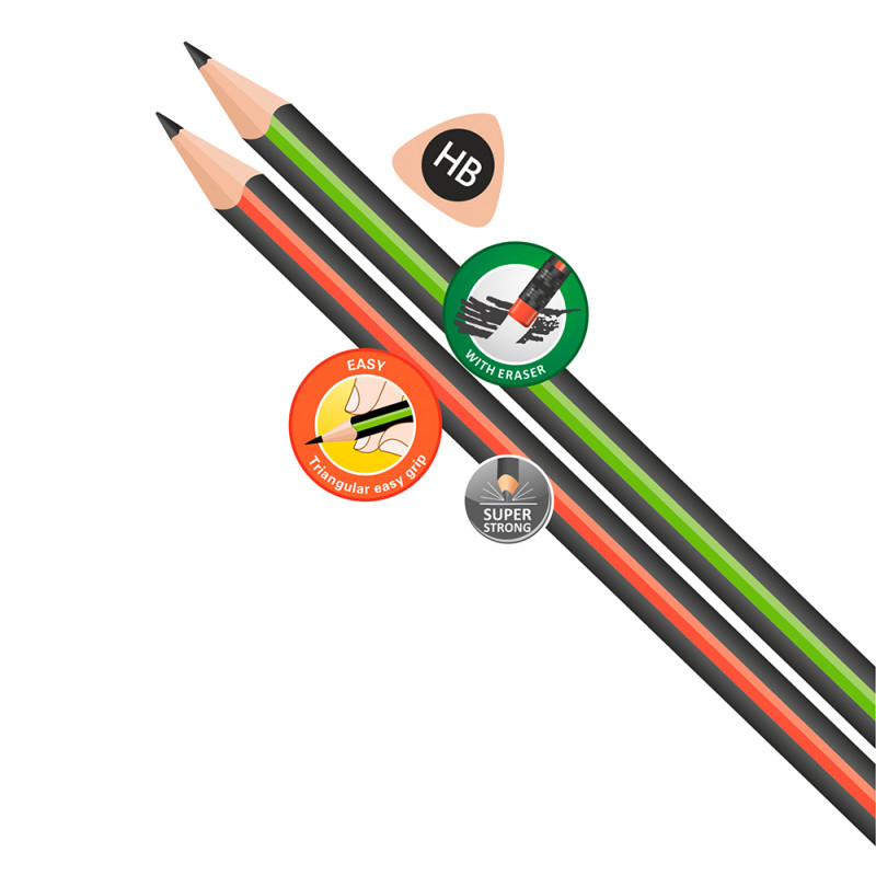 Kvalitní grafitová tužka s tuhou HB (∅ 2,2 mm), ideální pro psaní i kreslení. Ergonomický trojhranný tvar zajišťuje pohodlné držení. Tuha je lepená po celé délce, což zvyšuje její odolnost proti lámání. Měkká pryž v barvě těla umožňuje snadné a čisté mazání bez poškození papíru. Dodáváno v mixu 6 veselých barev.
