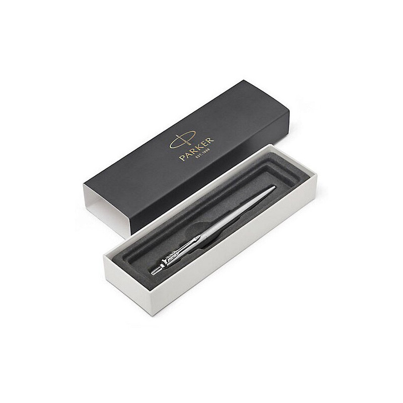 kuličkové pero Parker Jotter v elegantním dárkovém balení, tělo z broušené nerezové oceli, vkombinaci s klipem pokoveným chromem, s leštěnou úpravou, stiskací mechanismu, modrá nebo černá náplň dle skladové dostupnosti, nelze vybrat
