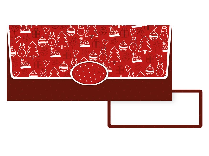 Dárková obálka na peníze s vánočním motivem a uzavíratelnou klopou. Darujte svým blízkým dárek k Vánocům v podobě obálky na peníze. Do obálky lze vložit peníze nebo dárkový poukaz. Uvnitř je kartička bez textu, na kterou můžete napsat věnování. BARVA: bordó/červená MOTIV: sněhuláci, stromky, čepice, vánoční baňky, dárky Dodáváme v plastovém sáčku se závěsem. Uvedená cena je za 1 ks.