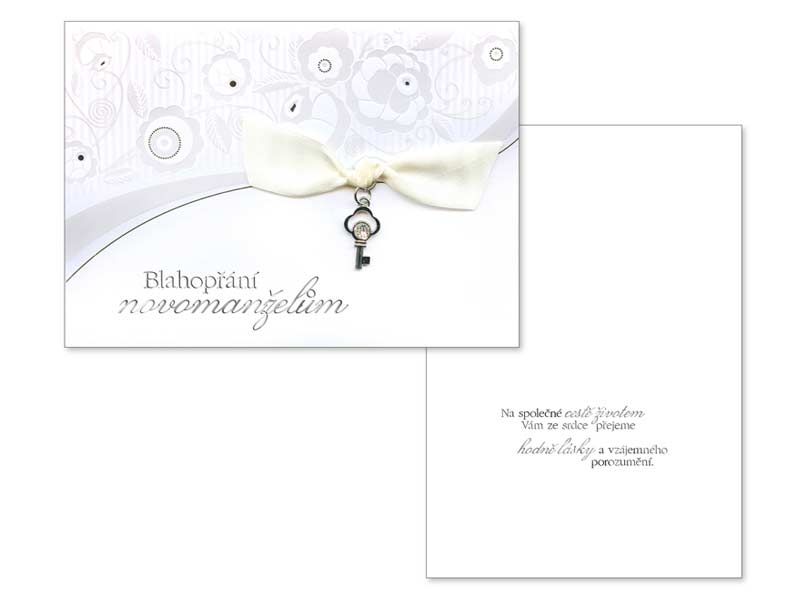 Svatební přání s textem. Svatba je příjemná a mimořádná událost a je začátkem nové etapy života. Mezi svatebními dary by nikdy nemělo chybět i přání novomanželům. Udělejte radost novomanželům a věnujte jim přání k jejich svazku, díky kterému si vždy připomenou krásné začátky jejich manželství. Nápis je vyrytý stříbrným písmem a na přání je mašlička s klíčkem. Text na přední straně přání: Blahopřání novomanželům Text uvnitř přání: Na společné cestě životem Vám ze srdce přejeme hodně lásky a vzájemného porozumění. papír: pohlednicový karton 240 g Přání je baleno v sáčku. Součástí přání je i obálka. Uvedená cena je za 1 ks.