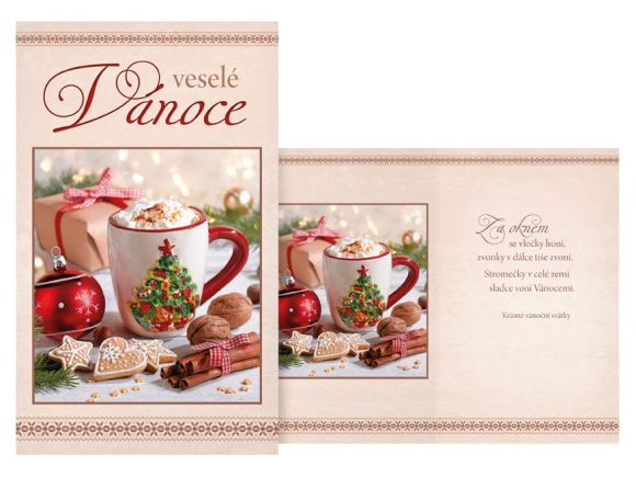 Vánoční přání malé. Nezapomeňte poslat krásné vánoční přání Vašim známým. Určitě je potěší to, že jste si na ně vzpomněli. Text na přední straně: Veselé Vánoce Text uvnitř přání: Za oknem se vločky honí, zvonky v dálce tiše zvoní. Stromečky v celé zemi, sladce voní Vánocemi. Krásné vánoční svátky Papír: pohlednicový karton Přání je baleno v sáčku, součástí balení je i dopisní obálka. Uvedená cena je za 1 ks.