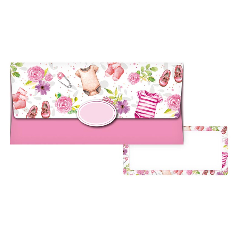 Dárková obálka na peníze s motivem pro miminka (holčičky). Udělejte novopečeným rodičům radost a věnujte jim obálku s penězi. Uvnitř je kartička bez textu, na kterou můžete napsat věnování.