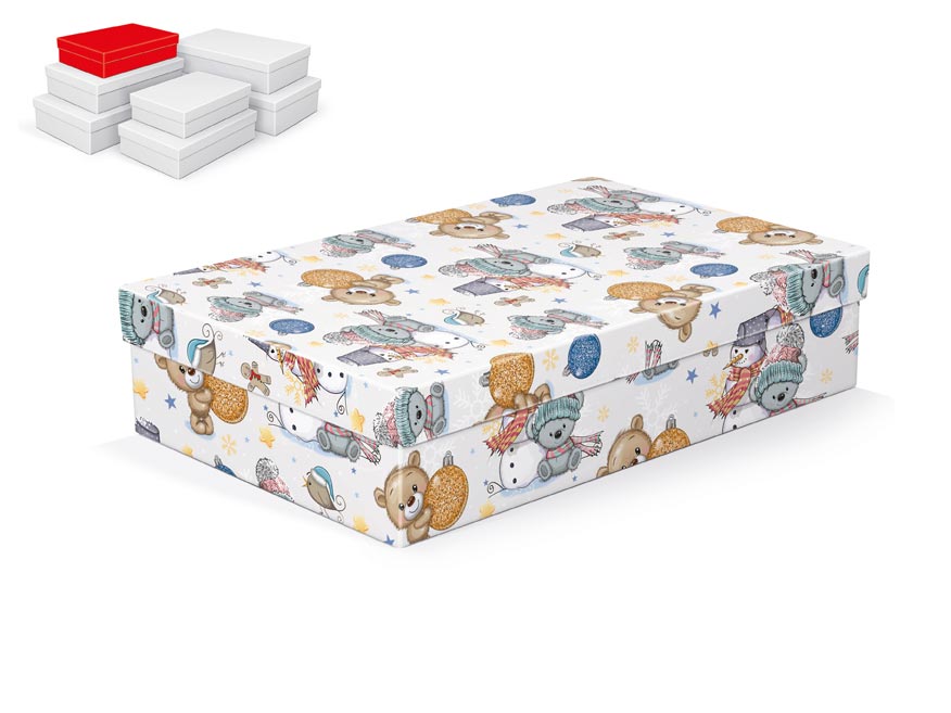 Vánoční dárková krabice o rozměrech 30 x 19 x 7 cm Dárková krabice s dětským motivem medvídků, vánočních ozdob a sněhuláků. Dodáváme pouze v setu 7 dárkových krabiček, které jsou ve stejném designu, ale v různých velikostech. Při vložení do košíku se automaticky vloží i ostatní krabičky, tak aby jste měli v košíku vždy celý, kompletní set. Uvedená cena je za 1 ks. Materiál: 1,5 mm karton, potažený papírem s potiskem Set obsahuje tyto krabice: 5371023 Krabice dárková vánoční A-V010-A 24x16x6 cm 5371024 Krabice dárková vánoční A-V010-B 26x17x6 cm 5371025 Krabice dárková vánoční A-V010-C 28x18x7 cm 5371026 Krabice dárková vánoční A-V010-D 30x19x7 cm 5371027 Krabice dárková vánoční A-V010-E 32x20x8 cm 5371028 Krabice dárková vánoční A-V010-F 34x22x8 cm 5371029 Krabice dárková vánoční A-V010-G 36x22x9 cm