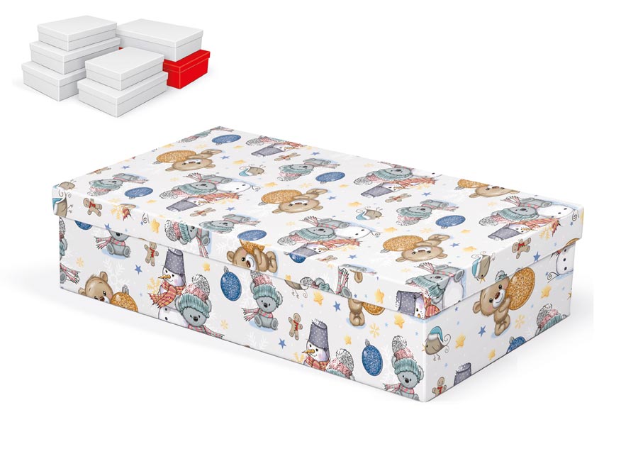 Vánoční dárková krabice o rozměrech 36 x 22 x 9 cm Dárková krabice s dětským motivem medvídků, vánočních ozdob a sněhuláků. Dodáváme pouze v setu 7 dárkových krabiček, které jsou ve stejném designu, ale v různých velikostech. Při vložení do košíku se automaticky vloží i ostatní krabičky, tak aby jste měli v košíku vždy celý, kompletní set. Uvedená cena je za 1 ks. Materiál: 1,5 mm karton, potažený papírem s potiskem Set obsahuje tyto krabice: 5371023 Krabice dárková vánoční A-V010-A 24x16x6 cm 5371024 Krabice dárková vánoční A-V010-B 26x17x6 cm 5371025 Krabice dárková vánoční A-V010-C 28x18x7 cm 5371026 Krabice dárková vánoční A-V010-D 30x19x7 cm 5371027 Krabice dárková vánoční A-V010-E 32x20x8 cm 5371028 Krabice dárková vánoční A-V010-F 34x22x8 cm 5371029 Krabice dárková vánoční A-V010-G 36x22x9 cm