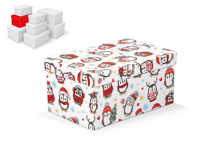 Vánoční dárková krabice o rozměrech 22 x 14 x 11 cm Dárková krabice s dětským, vánočním motivem tučňáků. Dodáváme pouze v setu 8 dárkových krabiček, které jsou ve stejném designu, ale různých velikostech. Při vložení do košíku se automaticky vloží i ostatní krabičky, tak aby jste měli v košíku vždy celý, kompletní set. Uvedená cena je za 1 ks. Materiál: 1,5 mm karton, potažený papírem s potiskem Set obsahuje tyto krabice: 5371038 Krabice dárková B-V009-A 16x10x8 cm 5371039 Krabice dárková B-V009-B 18x11x9 cm 5371040 Krabice dárková B-V009-C 20x12x10 cm 5371041 Krabice dárková B-V009-D 22x14x11 cm 5371042 Krabice dárková B-V009-E 24x16x12 cm 5371043 Krabice dárková B-V009-F 26x17x13 cm 5371044 Krabice dárková B-V009-G 28x18x14 cm 5371045 Krabice dárková B-V009-H 30x19x15 cm
