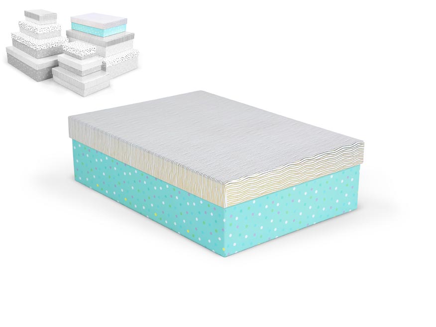 Dárková krabice v mixu pastelových barev s různými vzory, jako jsou puntíky, proužky nebo texturovaný povrch. Vzory a barvy jsou sladěny tak, aby vytvářely harmonický a elegantní vzhled. Vhodná pro slavnostní příležitosti, dekorativní účely, balení osobních darů nebo k uschování různých drobností. Při vložení jedné krabičky do košíku se automaticky přidá celá sada, která zahrnuje krabičky s různými designy a velikostmi. Tato variabilita zaručuje, že budete mít krabičky vhodné pro různé příležitosti a typy dárků. Krabičky jsou elegantně navrženy a ladí k sobě svými barvami a vzory, čímž vytvářejí harmonickou sadu ideální pro každou příležitost.
