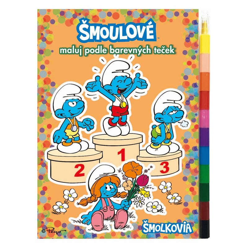 Popis k výrobku: Omalovánka Šmoulové - maluj podle barevných teček + maxi voskovka