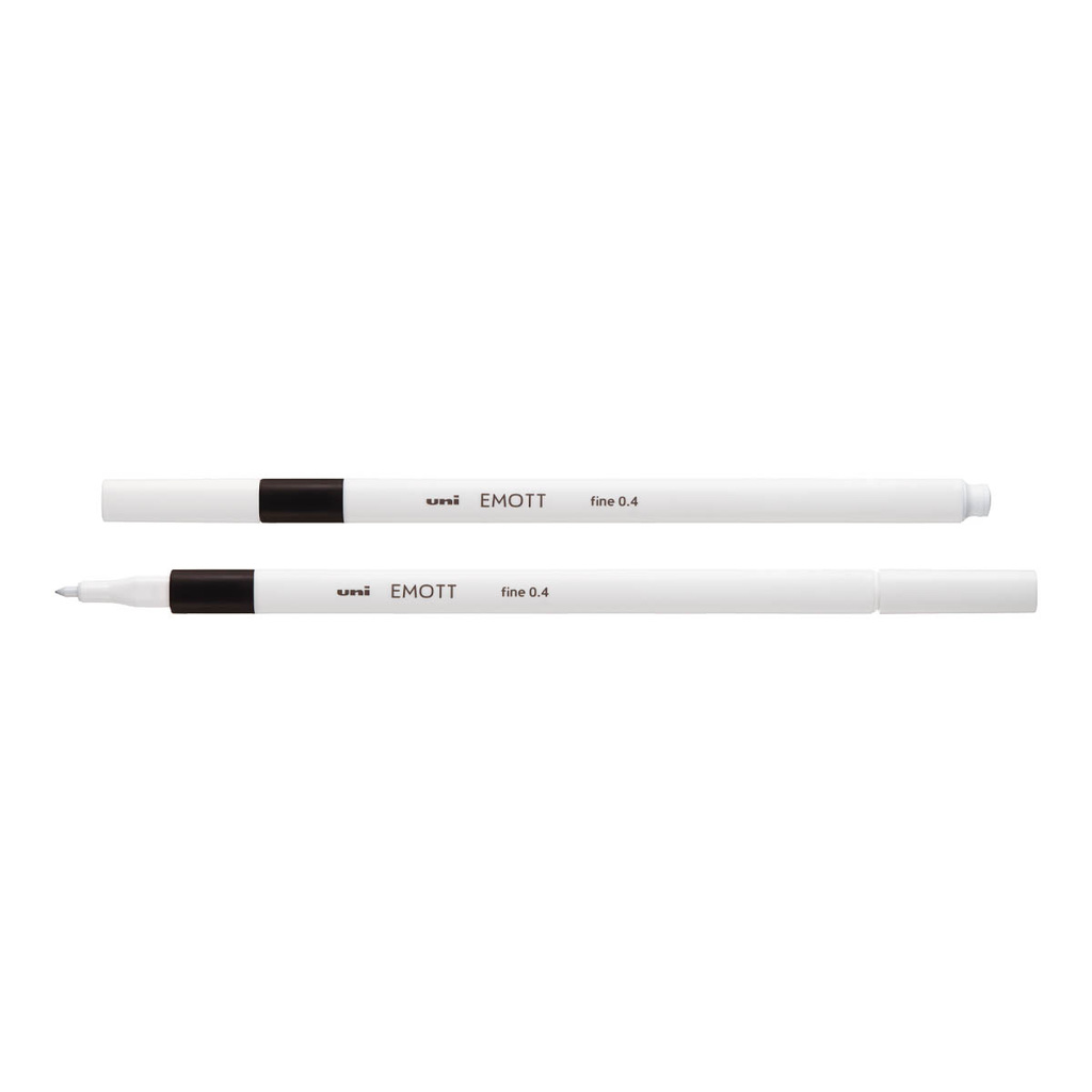 moderní design, rafinované a minimalistické tělo, bílý hrot, to je Emott, liner pro každodenní psaní, skicování i kreslení, s více než 40 barvami od sladkých tónů po jemné pastely, přes zářivé základní barvy až k odvážným zemitým tónům, lehce uniknete do svého kreativního barevného světa, Emott – vyjádřete své emoce stylově, barva černá, tenké tělo s víčkem, čtvercový tvar pro lepší úchop, vhodný na psaní i kreslení, odolný hrot, šířka stopy 0,4 mm