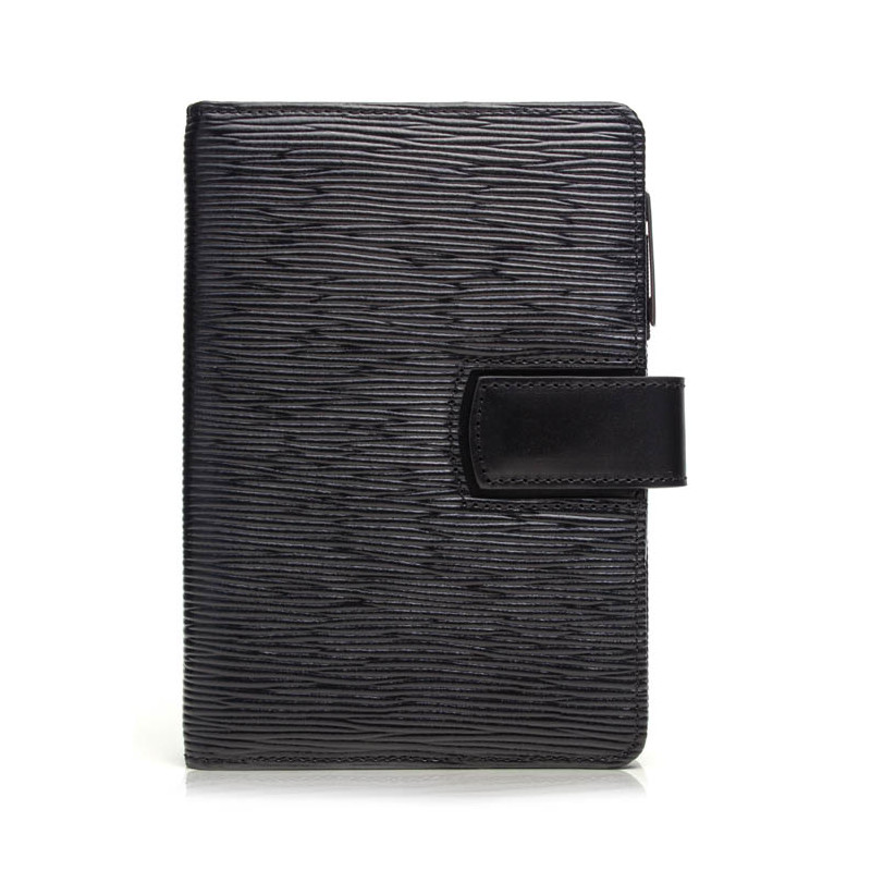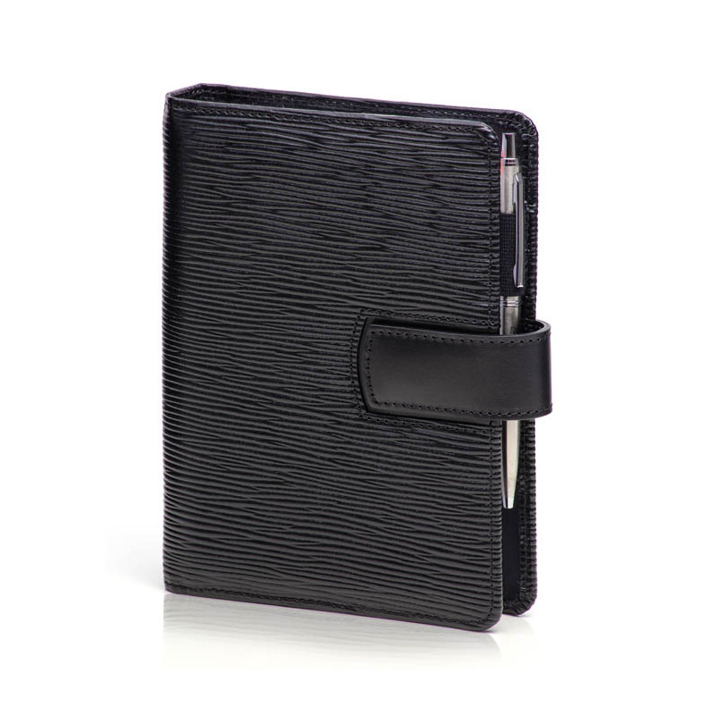luxusní kroužkový diář ADK Rondo v černé barvě s týdenním plánováním, desky jsou šité ručně v České republice z kvalitní kůže s vroubkovaným reliéfem, ušito v ČR, pohodlné a rychlé zavírání díky magnetické zápince, tenčí „slim“ provedení s jednoduchým vnitřním uspořádáním, diář obsahuje týdenní plánování, poznámkové listy, kuličkovou tužku ADK a pravítko. Rozměry desek A6: 18 x 13 x 3 cm, náplně: 16 x 10,5 cm