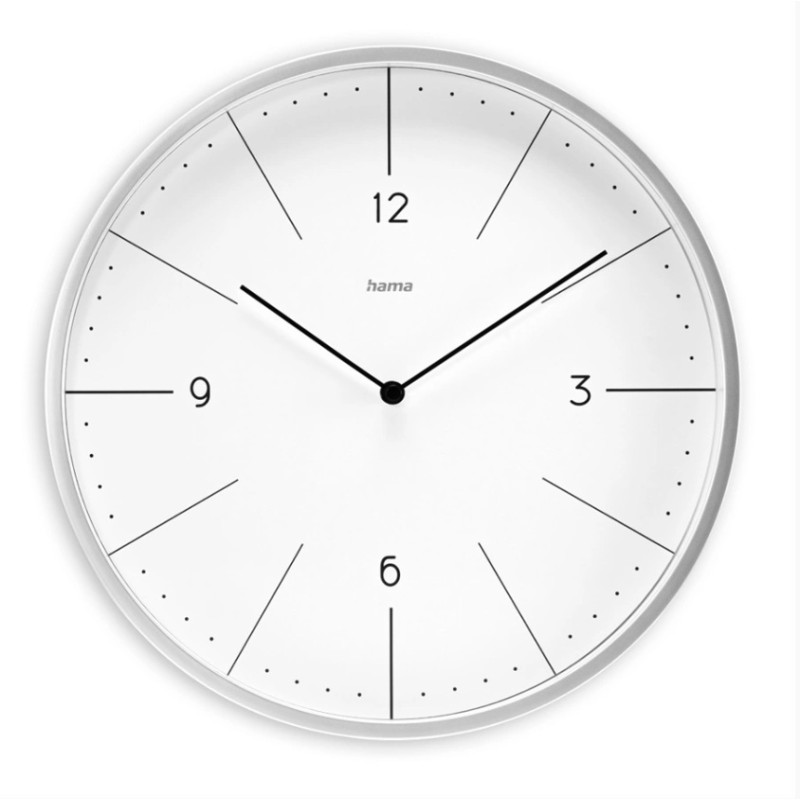 nástěnné hodiny s analogovým zobrazením času, hodinová a minutová ručička, tichý chod bez hlasitého tikání, bílý ciferník s černými arabskými číslicemi 3, 6, 9 a 12, rozměry (průměr x hloubka): 30 x 3 cm, hmotnost: 472 g, napájení: 1x AA Mignon (součást balení), materiál obruby/krytu: plast/sklo, barva obruby/ciferníku: šedá/bílá, balení: papírová krabička s certifikovaným původem dřeva, bez obsahu plastů