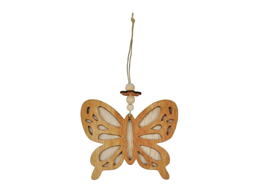 Krásná velikonoční dekorace v designu dřevěného motýla v přírodních barvách se závěsem, poslouží jako dekorace do exteriéru nebo na zkrášlení interiéru. Dekorace má provázek na zavěšení. Velikost: 100 mm Uvedená cena je za 1 ks.