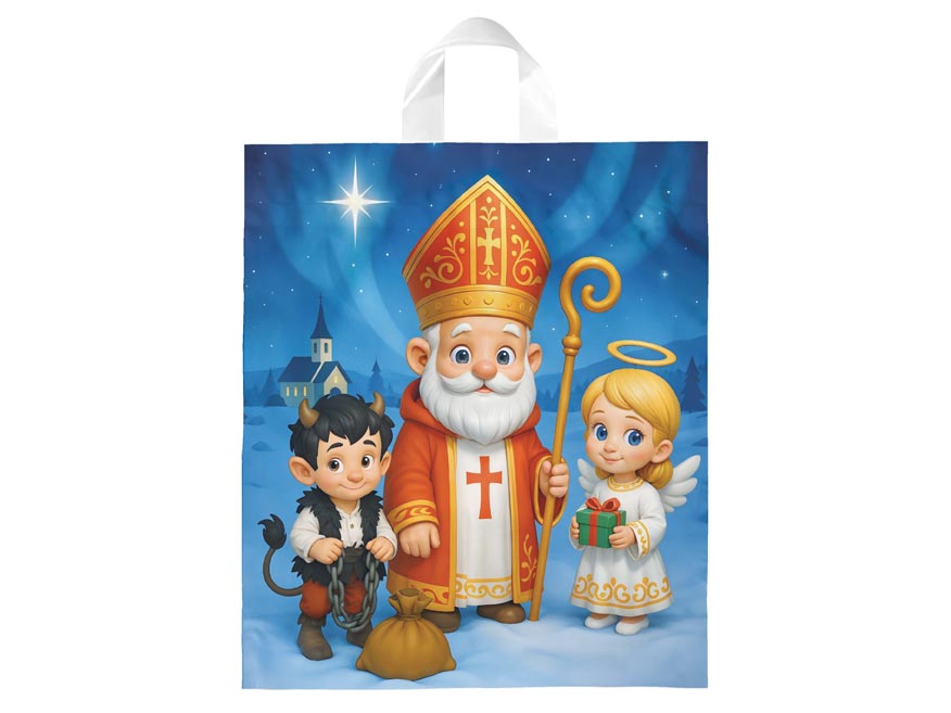 Ideální společník pro vaše nákupy! Igelitová nákupní taška s mikulášským motivem je ideální volbou pro předvánoční nákupy. Veselá zimní ilustrace s Mikulášem, andílkem a čertíkem dodá každému nákupu sváteční náladu. Díky pevnému materiálu, praktickým uchům a rozměrům je taška dostatečně prostorná i pro větší nákup. Skvělá kombinace funkčnosti a vánoční atmosféry. Síla igelitky: 0,050 mm Rozměr: 400 x 460 x 80 mm Uvedená cena je za 1 ks.