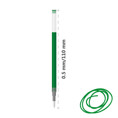 Gelová náplň do péra, zelená barva, délka 110 mm, průměr kuličky 0,5 mm.