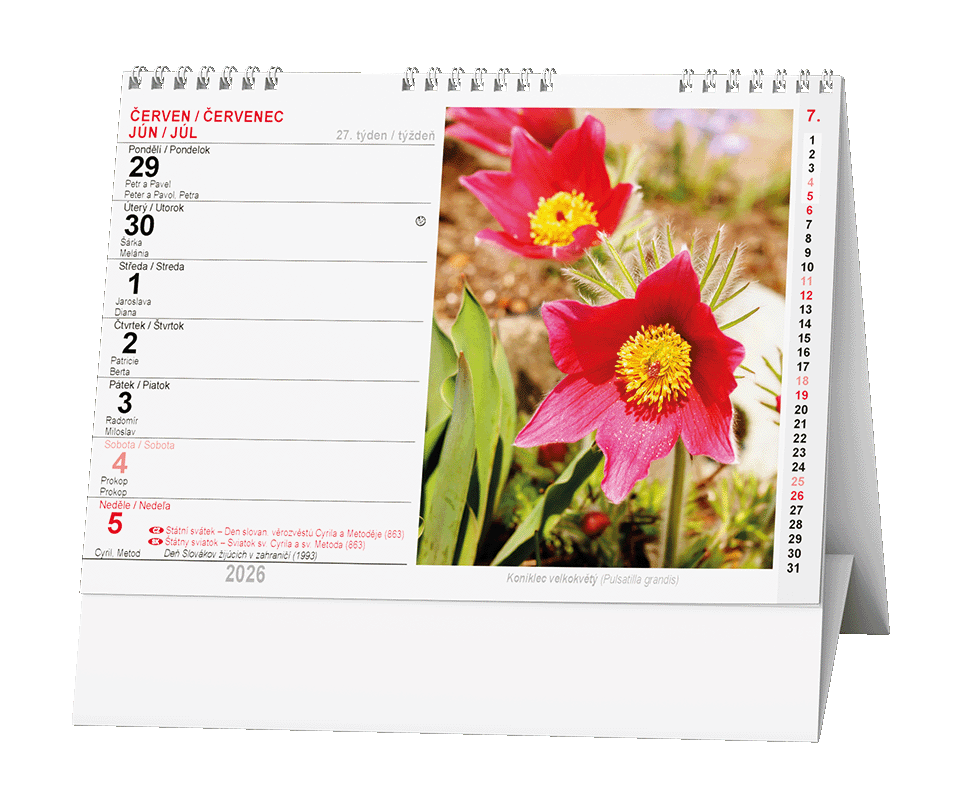 české a slovenské týdenní jmenné kalendárium, měsíční fáze, roční období, letní a zimní čas, formát 21 x 15 cm