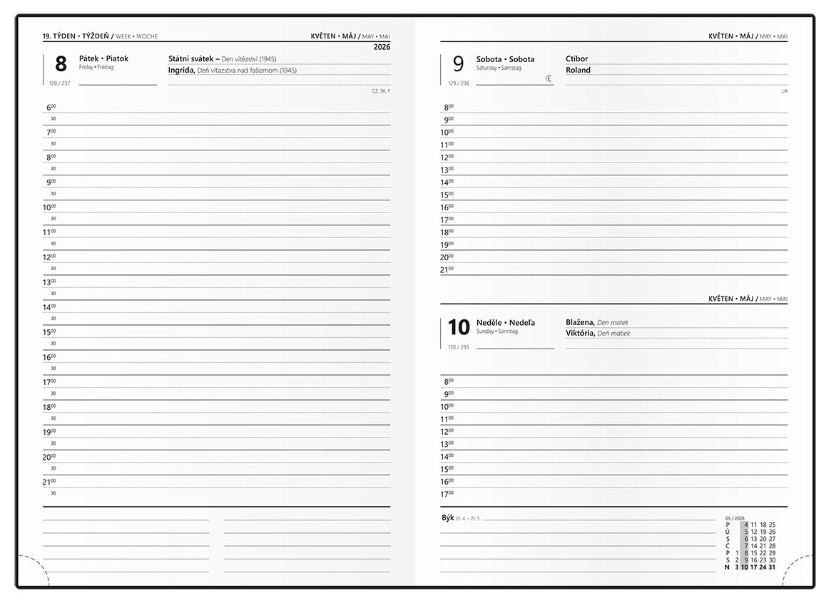 jemný hladký materiál, ražba motivu včetně ražby roku, rovný hřbet, , české a slovenské jmenné kalendárium, mezinárodní svátky, měsíční fáze, roční období, letní a zimní čas, místo na poznámky, formát 12 x 16,5 cm