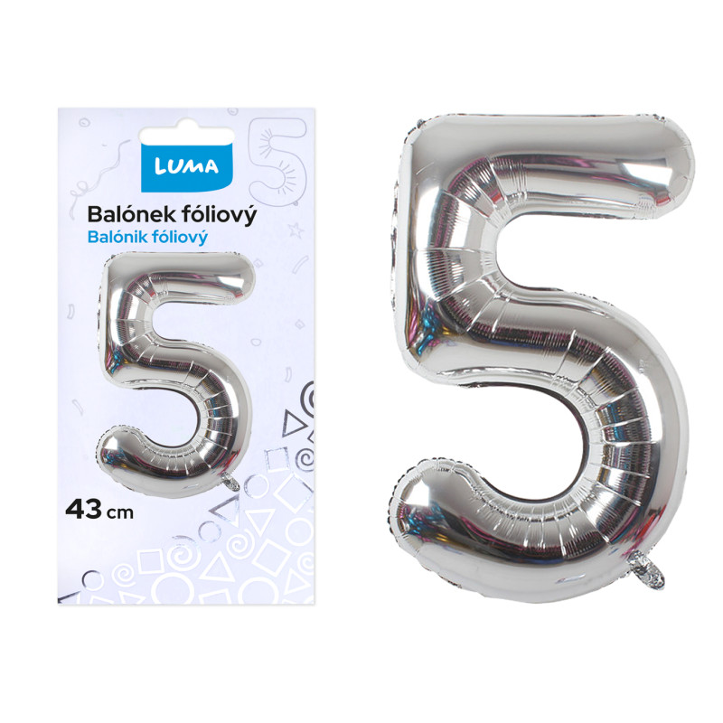Popis k výrobku: Balónek nafukovací č. 5 - stříbrný / 43cm vhodný jako výzdoba narozeninové párty, karnevalu a dalších oslav, rozměr 43 cm (ve vyfouklém stavu), lze plnit vzduchem i heliem, můžete opakovaně dofukovat, balení obsahuje jednorázovou papírovou trubičku ke snadnému nafouknutí balónku