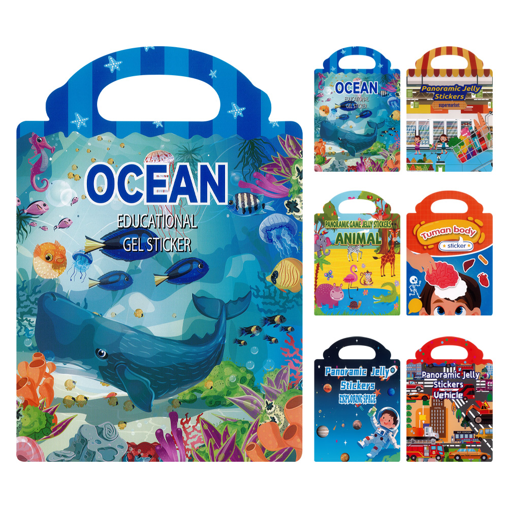 Otevřete 3 dílnou obálku s velkým panoramatickým obrázkem uvnitř a umístěte gelové nálepky postaviček/zvířátek na místo, které je pro ně nejpřirozenější (mix 8 motivů).