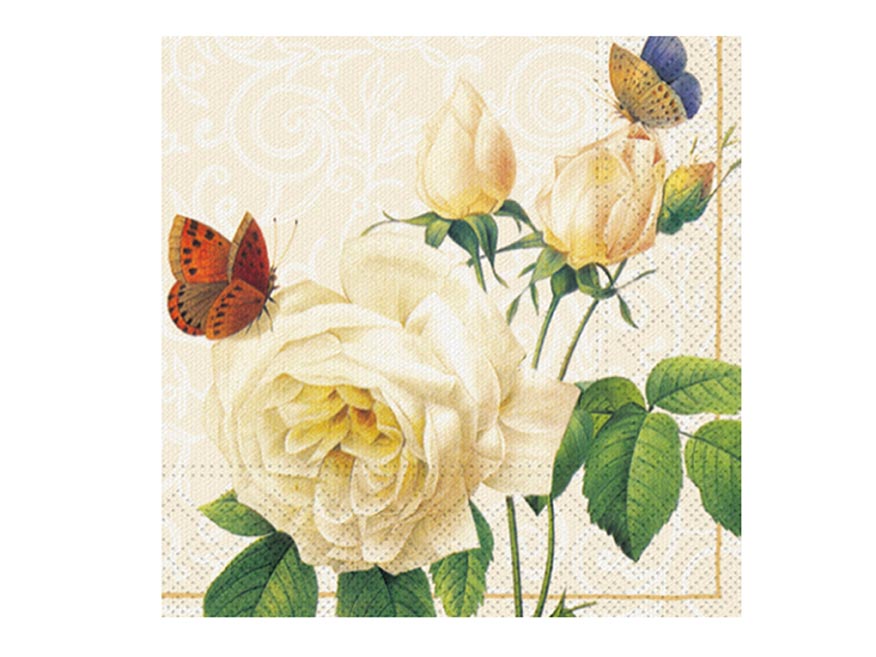 Celoroční ubrousek s růžemi a motýly Elegance, která nikdy nezestárne. Ubrousek s růžemi o rozměrech přinese na váš stůl jemnou krásu bílých a krémových květů, které symbolizují čistotu, romantiku a nadčasový půvab. Motiv doplňují dva barevní motýli, díky nimž působí kompozice svěže a živě. Kvalitní třívrstvé provedení zaručuje pevnost, příjemný dotek i dostatečnou savost – proto je ubrousek nejen krásný, ale i praktický. Skvěle se hodí pro svatby, oslavy výročí, letní zahradní posezení, ale i pro kreativní tvoření. Motiv: růže, motýli Rozměr: 33 × 33 cm POČET UBROUSKŮ V BALENÍ: 20 ks Uvedená cena je za 1 balení (20 kusů).