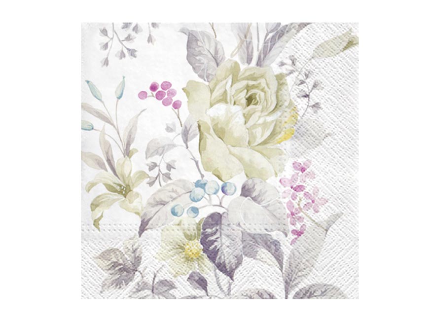Celoroční ubrousek akvarelové květy Váš stůl může být uměleckým dílem. Tento ubrousek s akvarelovými květy o rozměru 33 × 33 cm vnese do stolování jemnost a lehkost malovaného obrazu. Zelená růže, šedofialové listy a pastelové bobule vytvářejí harmonii tónů, která působí elegantně a moderně. Spojení krásného designu a kvality – třívrstvý ubrousek je pevný, měkký a spolehlivě savý. Proto skvěle poslouží jako elegantní doplněk stolování a stejně tak i jako oblíbený materiál pro decoupage a tvoření. Motiv: květy Rozměr: 33 × 33 cm POČET UBROUSKŮ V BALENÍ: 20 ks Uvedená cena je za 1 balení (20 kusů).