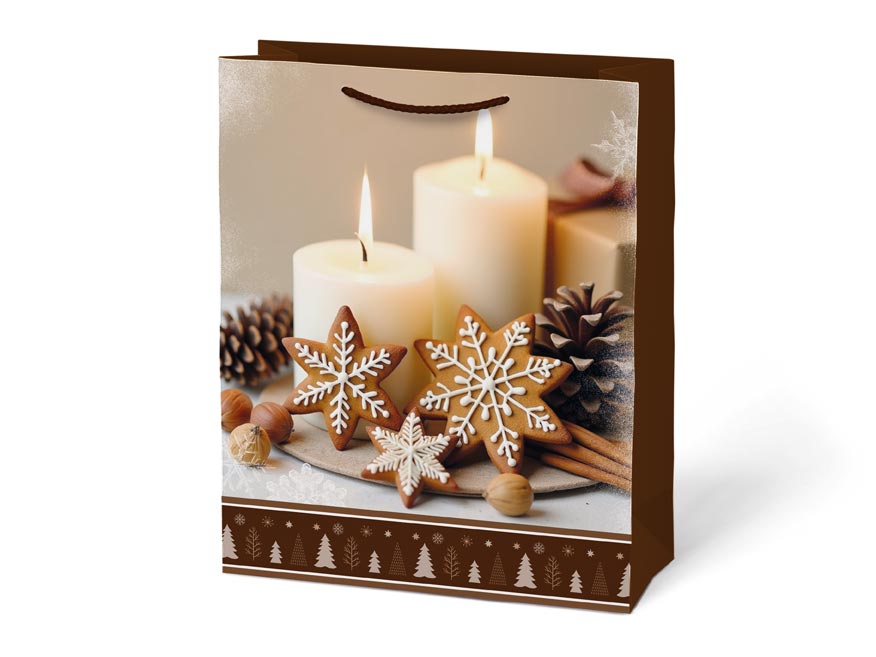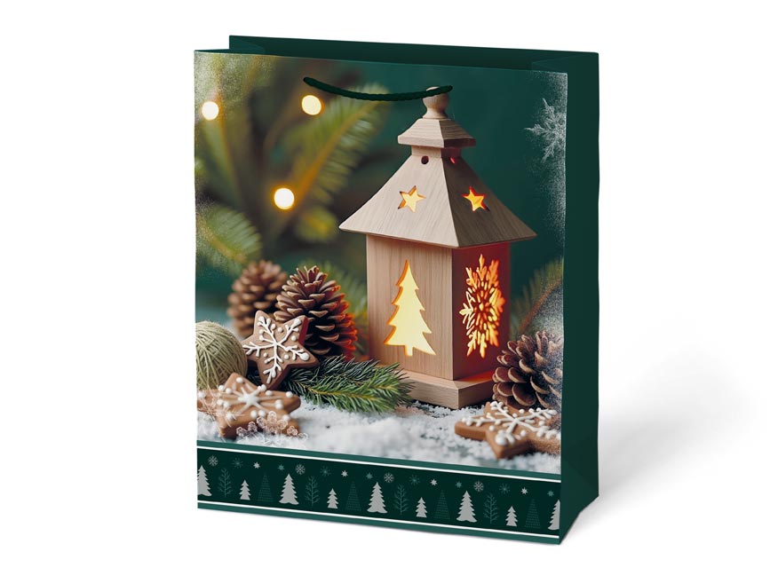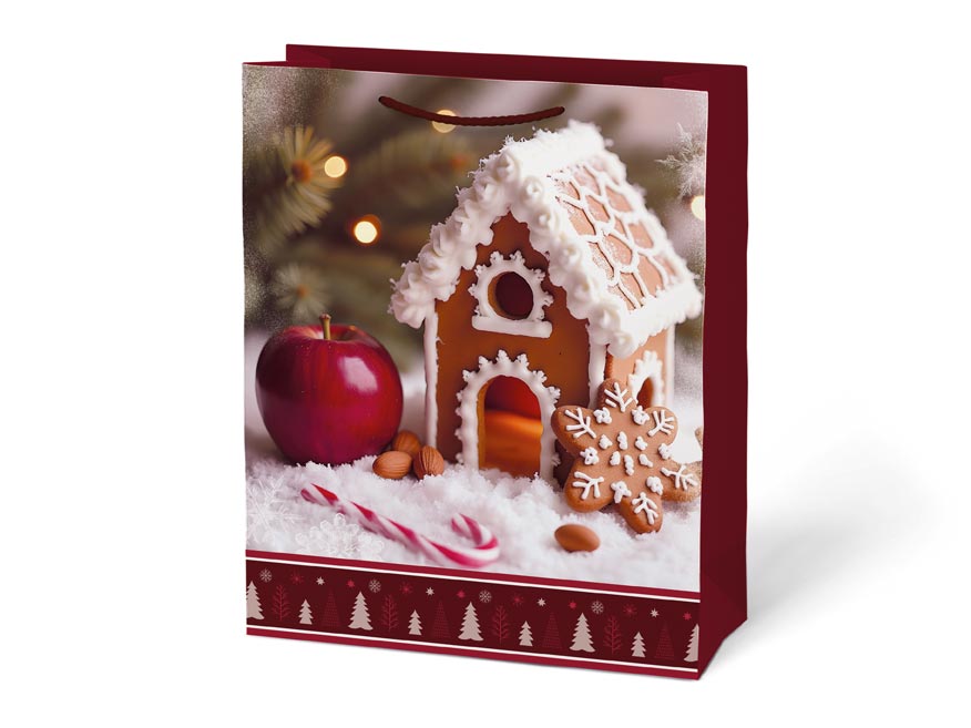Vánoční dárková taška MFP T5 – sváteční klasika Perníková chaloupka zasypaná sněhem, teplé světlo svíček, vánoční lucerna i dárky s mašlí – přesně takové motivy zdobí tuto vánoční dárkovou papírovou prostornou tašku MFP T5. Stačí vložit překvapení dovnitř a o sváteční atmosféru je postaráno. Motiv: vánoční Rozměry: 260 × 320 × 138 mm Barva: hnědá, modrá, bordó, zmavě zelená Dodáváme v mixu 4 motivů a barev dle aktuální skladové dostupnosti. Uvedená cena je za 1 ks.