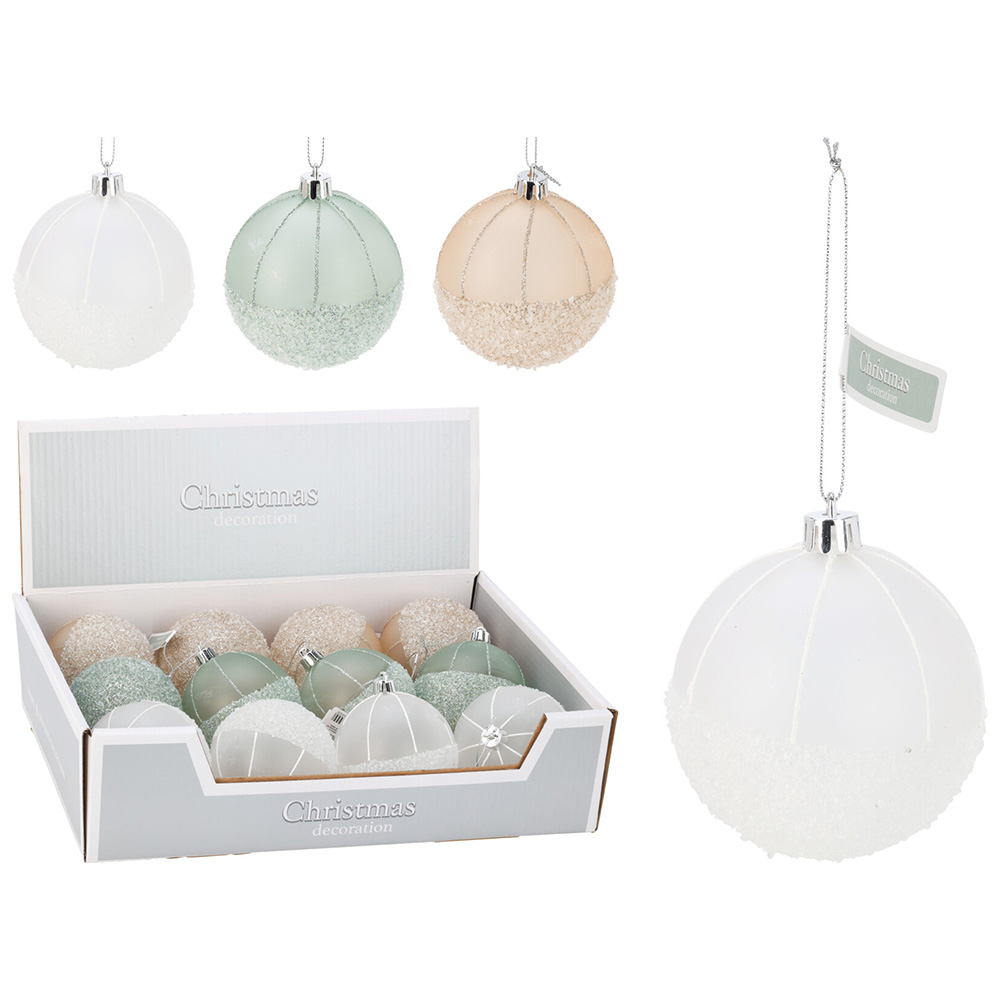 Popis k výrobku: Vánoční koule 80 mm třpytivá, zdobená sněhem (mix 3 barev, cena /1 ks)