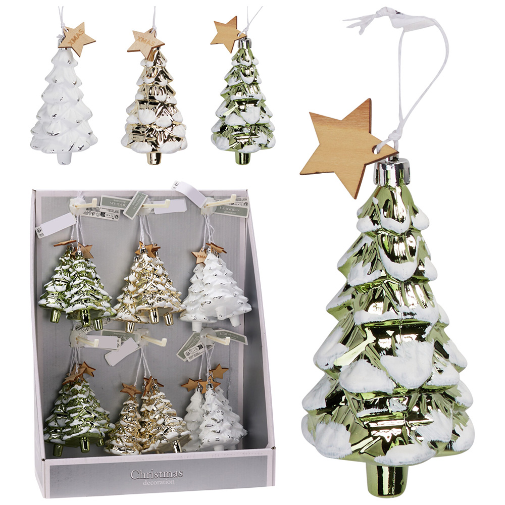 Zasněžený vánoční stromek jako závěsná ozdoba.