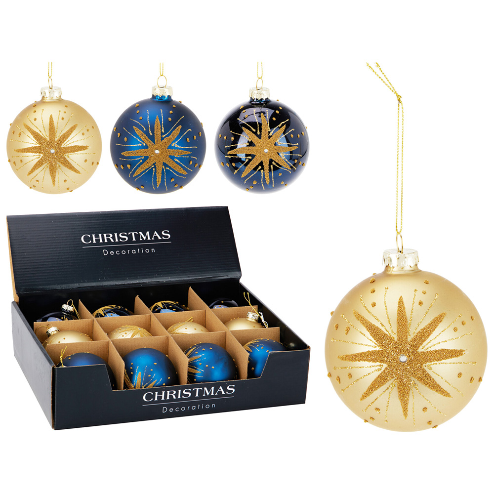 Vánoční koule modrá matná/lesklá a zlatá s dekorováním ve zlaté barvě (3 designy).