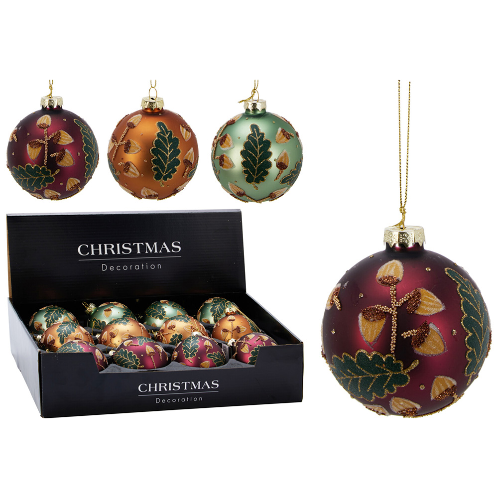 Popis k výrobku: Vánoční koule 80 mm, dekor list a žalud (mix 3 barev, cena /1 ks)