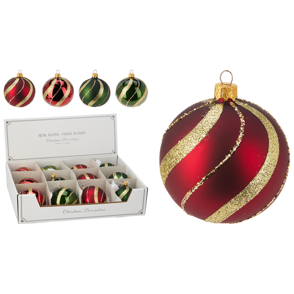 Vánoční koule matná červená / lesklá červená / matná zelená / lesklá zelená, dekorovaná třpytivým vzorem ve zlaté barvě.
