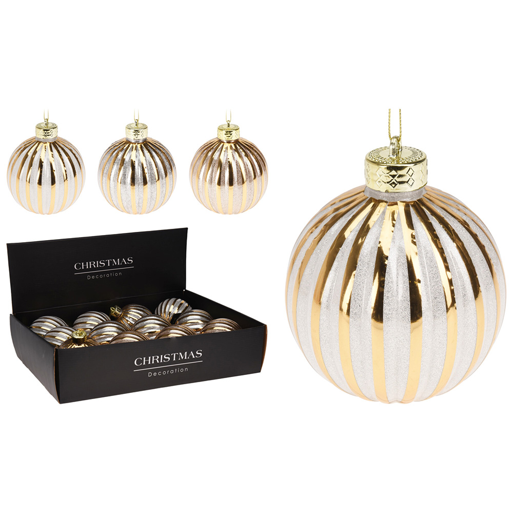 Popis k výrobku: Vánoční koule 100 mm, třpytivá, pruhovaný dekor (mix 3 barev, cena /1 ks)