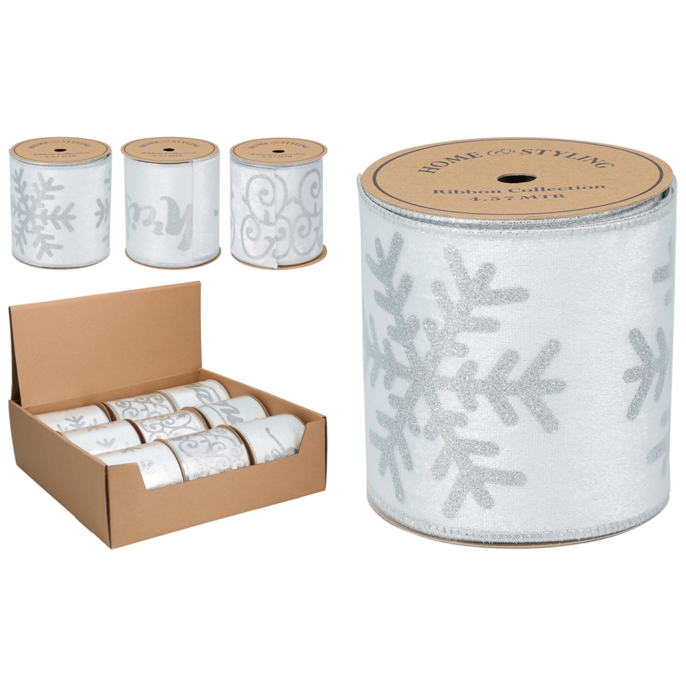 Popis k výrobku: Dekorační stuha 10x457 cm stříbrná / třpytivý potisk (mix 3 vzorů, cena /1 ks)