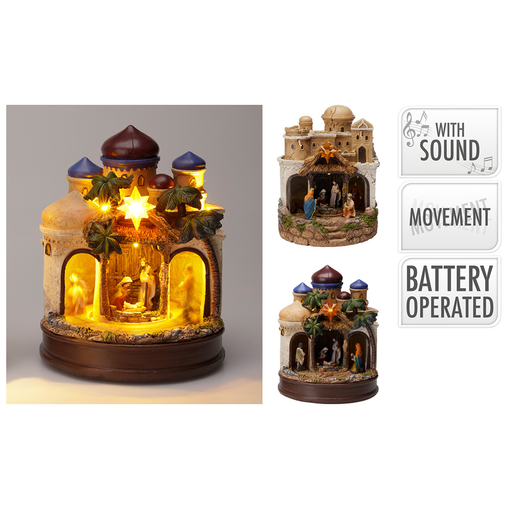 Popis k výrobku: Betlém s LED světlem, otočným pozadím a zvukem 22 cm (2 varianty /cena za 1 ks)