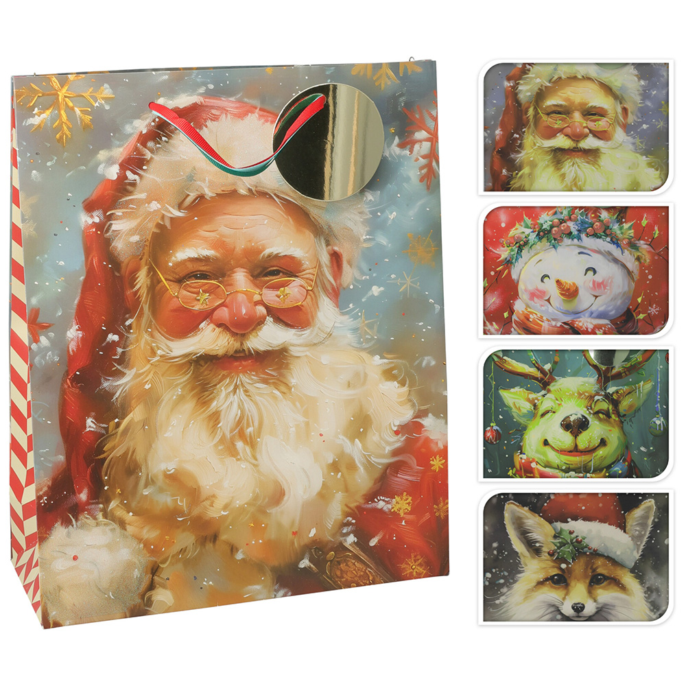 Vánoční dárková taška se třpytivým vzorem na přední straně ve 4 motivech střední velikosti.