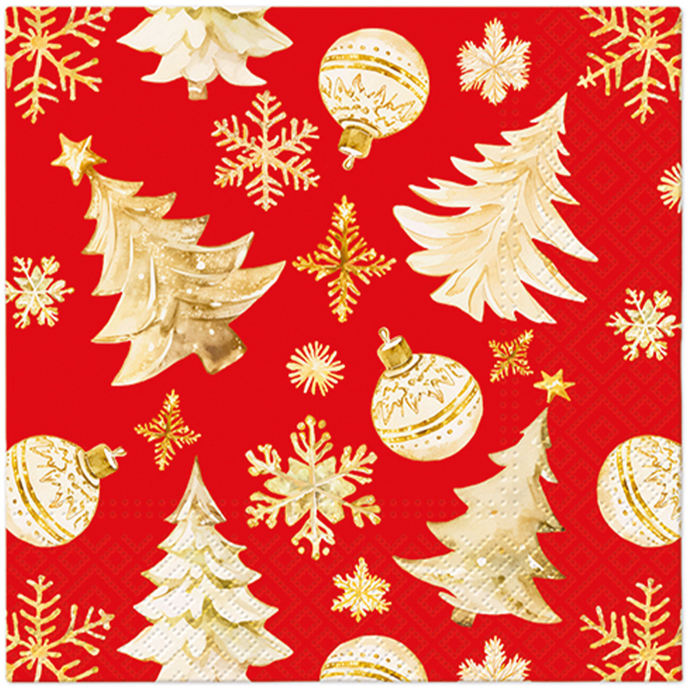 Popis k výrobku: Ubrousky PAW L 33x33cm Golden Christmas Trees Red Tyto ubrousky jsou vyrobeny z hedvábného papíru (100% celulóza). Jsou potištěny barvou s vysokou odolností proti opotřebení. Potisk s krásným motivem dodá Vašemu stolu tu pravou atmosféru. Rozměr: 33 x 33 cm. V jednom balení se nachází 20 kusů ubrousků.