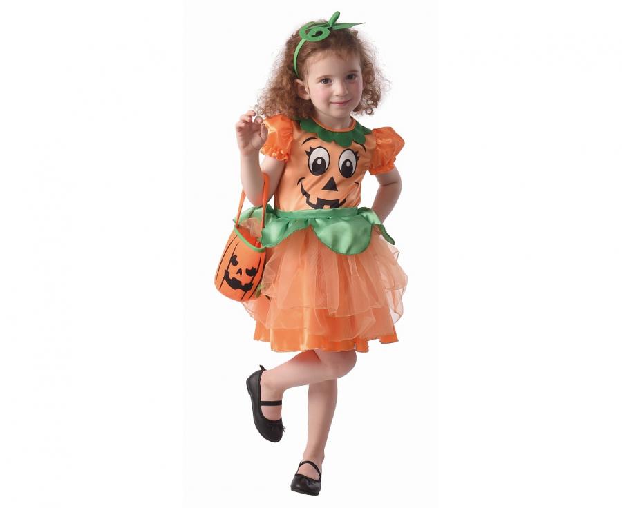 Dětský kostým s motivem dýně (šaty, čelenka, kabelka), velikost 92/104 cm