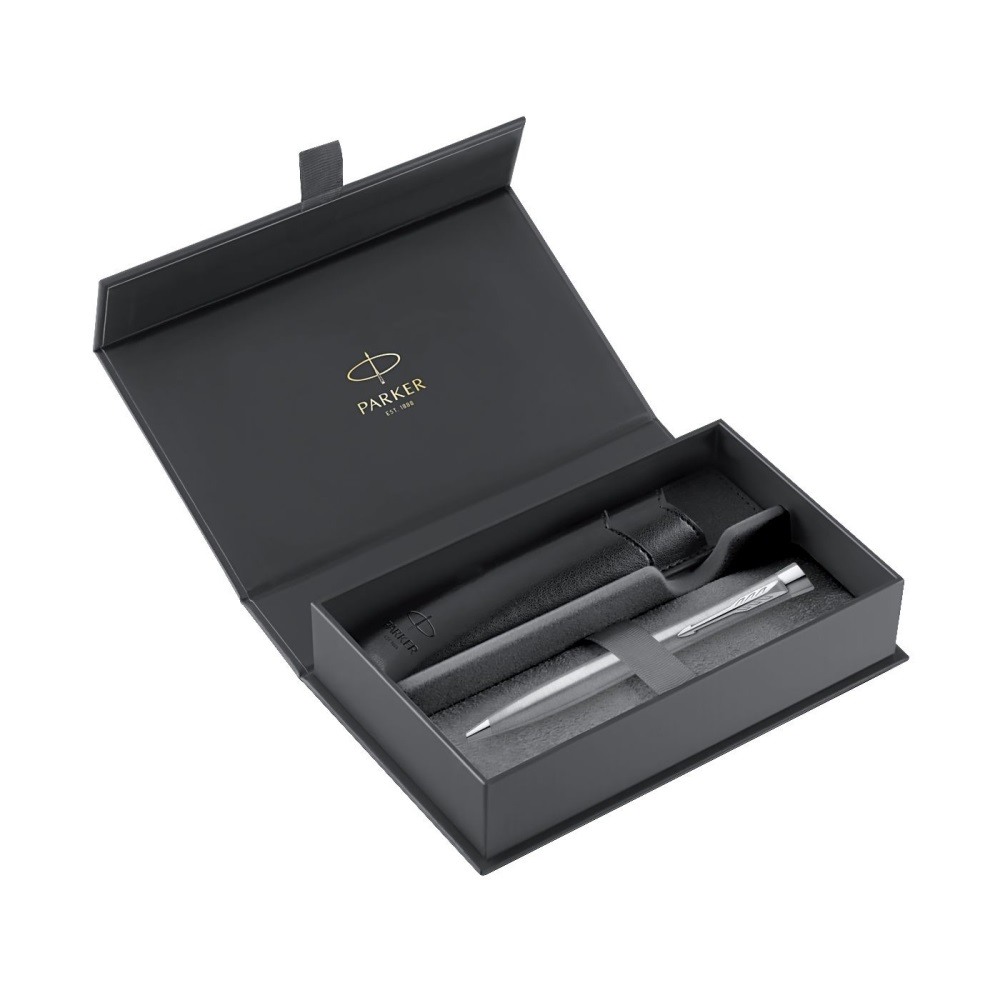 Souprava obsahuje zápisník v šedé barvě a kuličkové pero Parker Urban Metro Metallic s broušeným mosazným tělem s pochromovanou povrchovou úpravou, kovový úchop v kombinaci s doplňky pokovenými chromem.