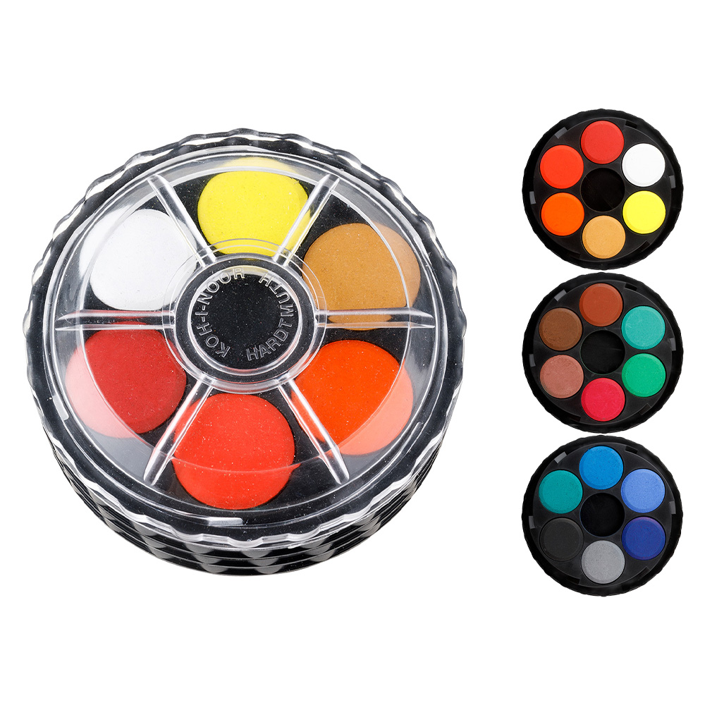 18-barevná sada netoxických vodových barev dodávaná v okrouhlém plastovém boxe. Průměr tablety 22,5 mm, vodou ředitelné, vhodné na papír a jiné savé materiály, 3 vrstvy po 6 tabletách, tj 18 odstínů barev: bílá, žlutá citronová, okr světlý, oranž., Rumělka červená sv., Rumělka červená tm., Karmínová, ultramarín sv., Modrá kobalt, modrá pařížská, zelená sv., Zelená tm., Sv. hnedá- cihlová, zelená olivová, siena pálená, umbra pálená, šedá, černá.