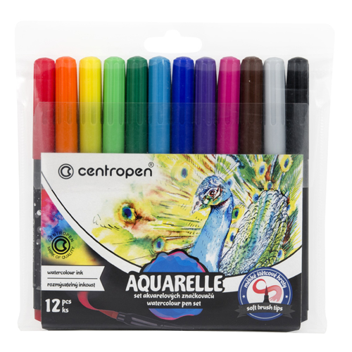 Popis k výrobku: Fixy CENTROPEN 8683 Aquarelle - sada 12 ks Sada akvarelových popisovačů se štětečkový hroty. Fixy jsou plněny inkoustem, který lze na speciálním papíře kombinovat a rozmývať vodou pomocí štětce. Po zaschnutí je možné obrázek domalovat černým linerem. Ergonomické držení. Šíře stopy 1-9 mm.
