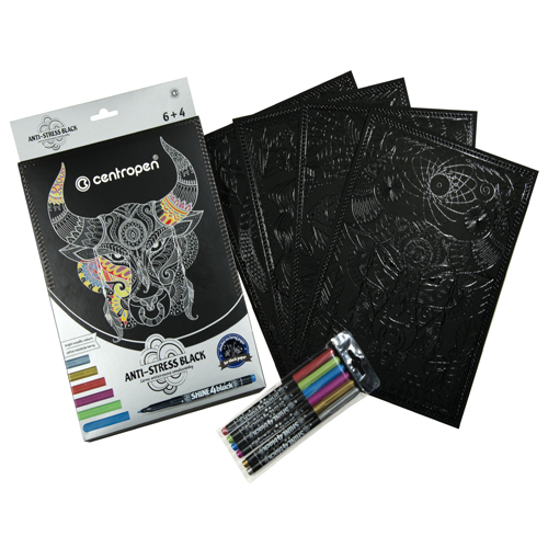 Unikátní kreativní sada černých antistresových omalovánek a metalických popisovačů pro chvíle relaxace. Vybarvením omalovánek metalickými fixy získáte jedinečný zářivý obrázek. Motivy omalovánek jsou vytištěny transparentním lakem na kvalitním černém papíře. Metalické popisovače se sytými inkousty s 1 mm tenkou stopou jsou ideální na vybarvování jemných detailů. Souprava obsahuje 4 černé omalovánky A4 a 6 metalických popisovačů. Šíře stopy 1 mm - ergonomické držení.