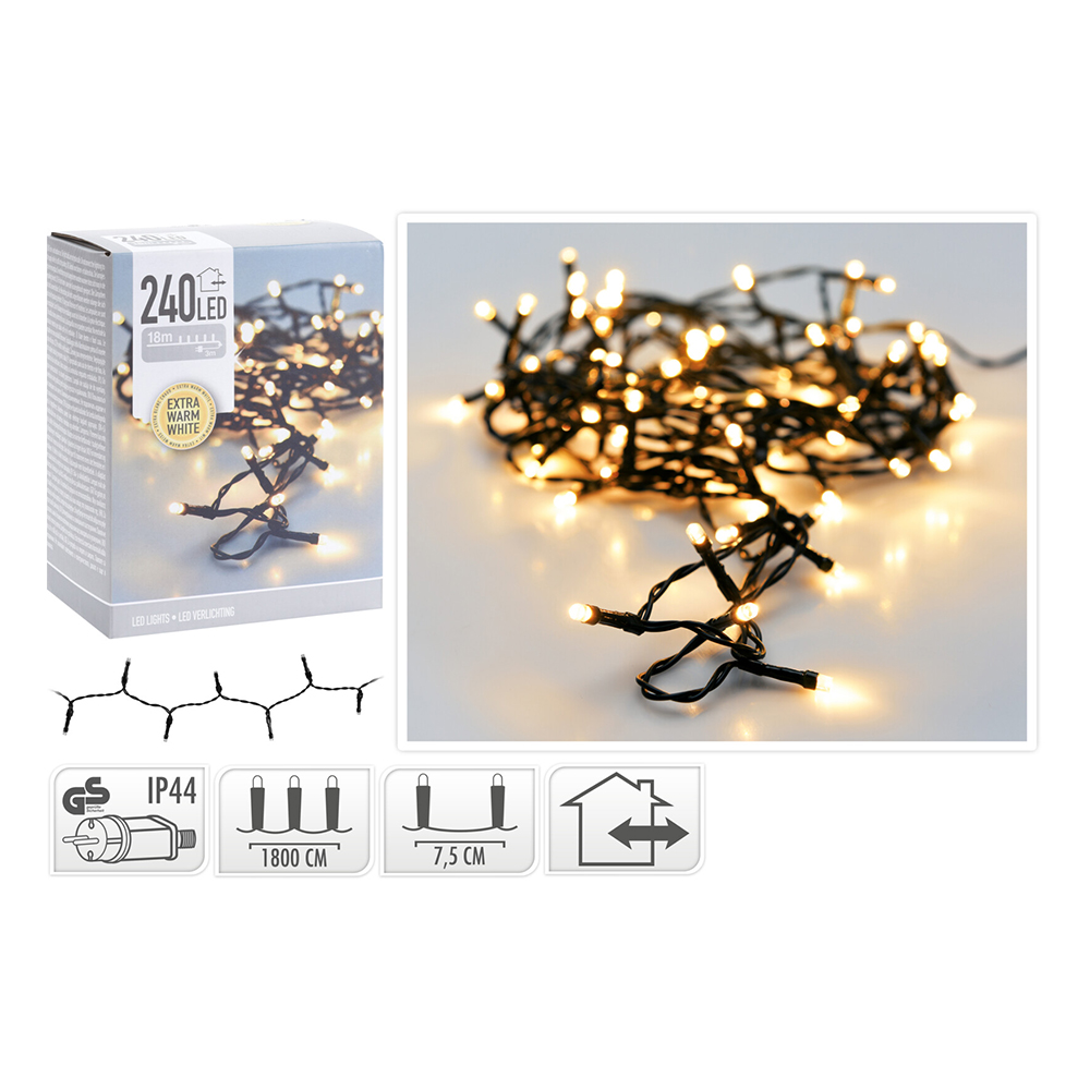 Popis k výrobku: Světelný řetěz 240 LED extra bílý teplý, délka 18 m, 230V (venk. použití) Svítící řetěz obsahuje 240 LED (5 mm) extra bílá teplá.