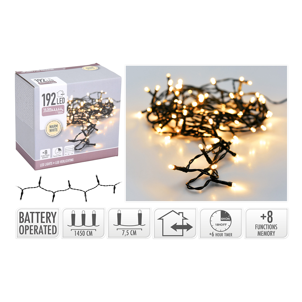 Popis k výrobku: Světelný řetěz 192 LED bílý teplý, délka 14,5 m (baterie 1,5V) Svítící řetěz obsahuje 192 LED (5 mm) bílá teplá.