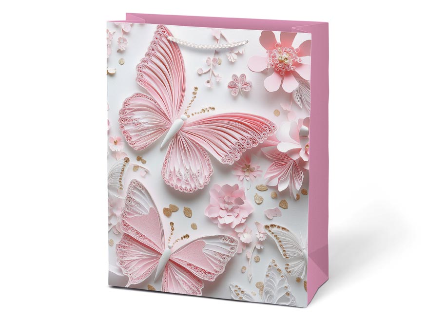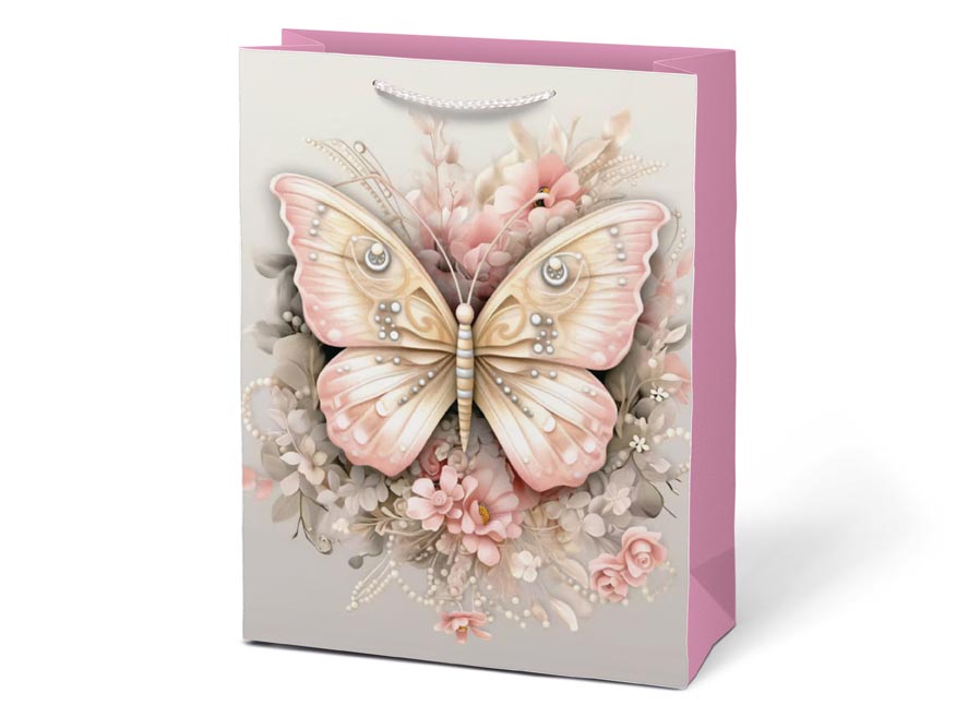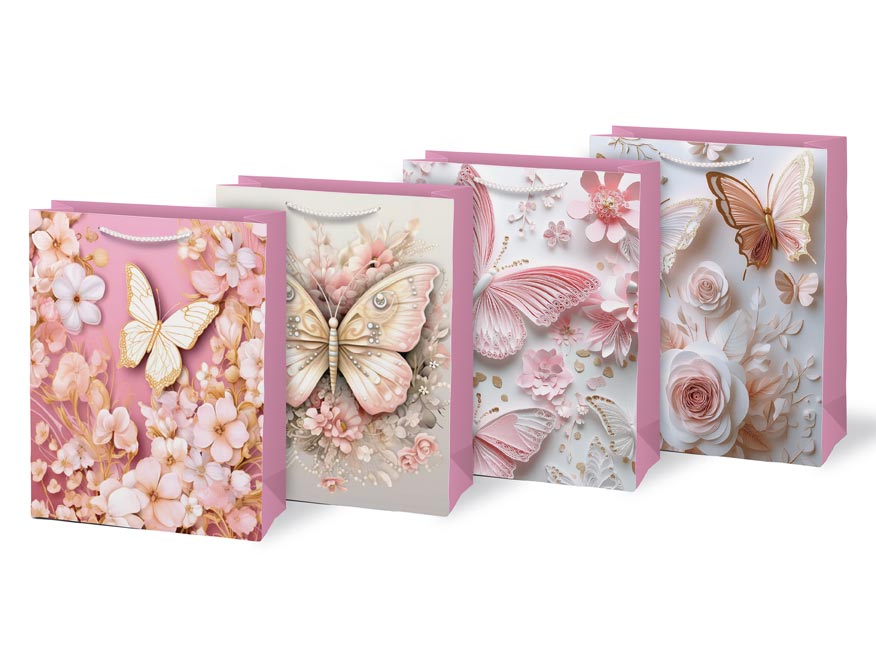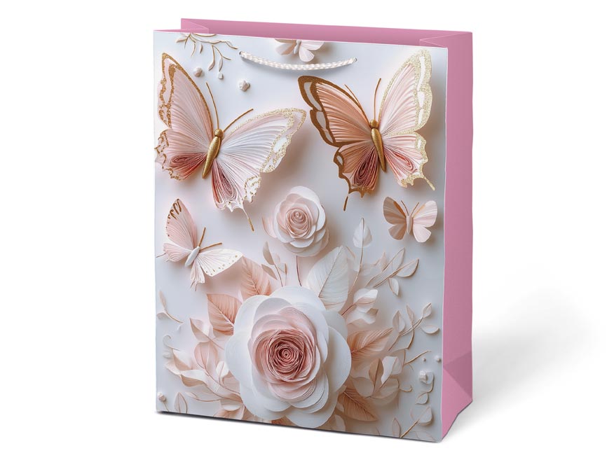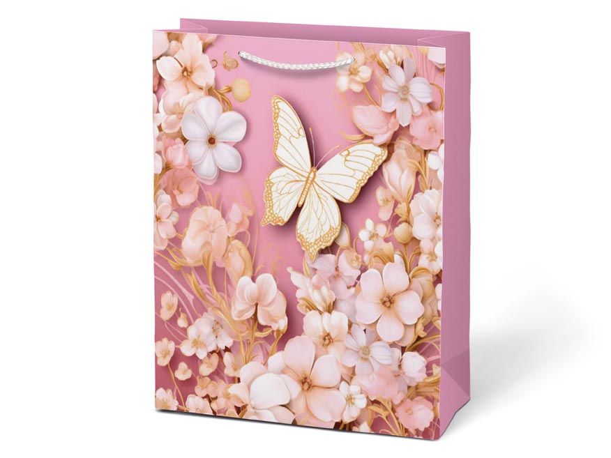 Každý dárek si zaslouží balení, které podtrhne jeho výjimečnost. Dárková taška M LUX přináší něžný motiv motýlů a květů v jemných odstínech. Působí elegantně, romanticky a díky promyšleným detailům se hodí pro nejrůznější příležitosti – od narozenin po svatební dary. Balení s ní je snadné a přitom působivé. Pletená ucha ladící s barvou tašky doplňují její čistý design. Díky svému vzhledu se taška stává součástí dárku – decentní, ale přesto nepřehlédnutelnou. Motiv: květy, motýli Rozměry: 260 x 320 x 120 mm Dodáváme v mixu čtyř vzorů dle aktuální skladové dostupnosti. Uvedená cena je za 1 ks.