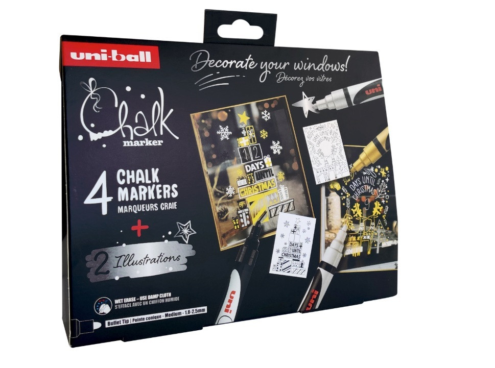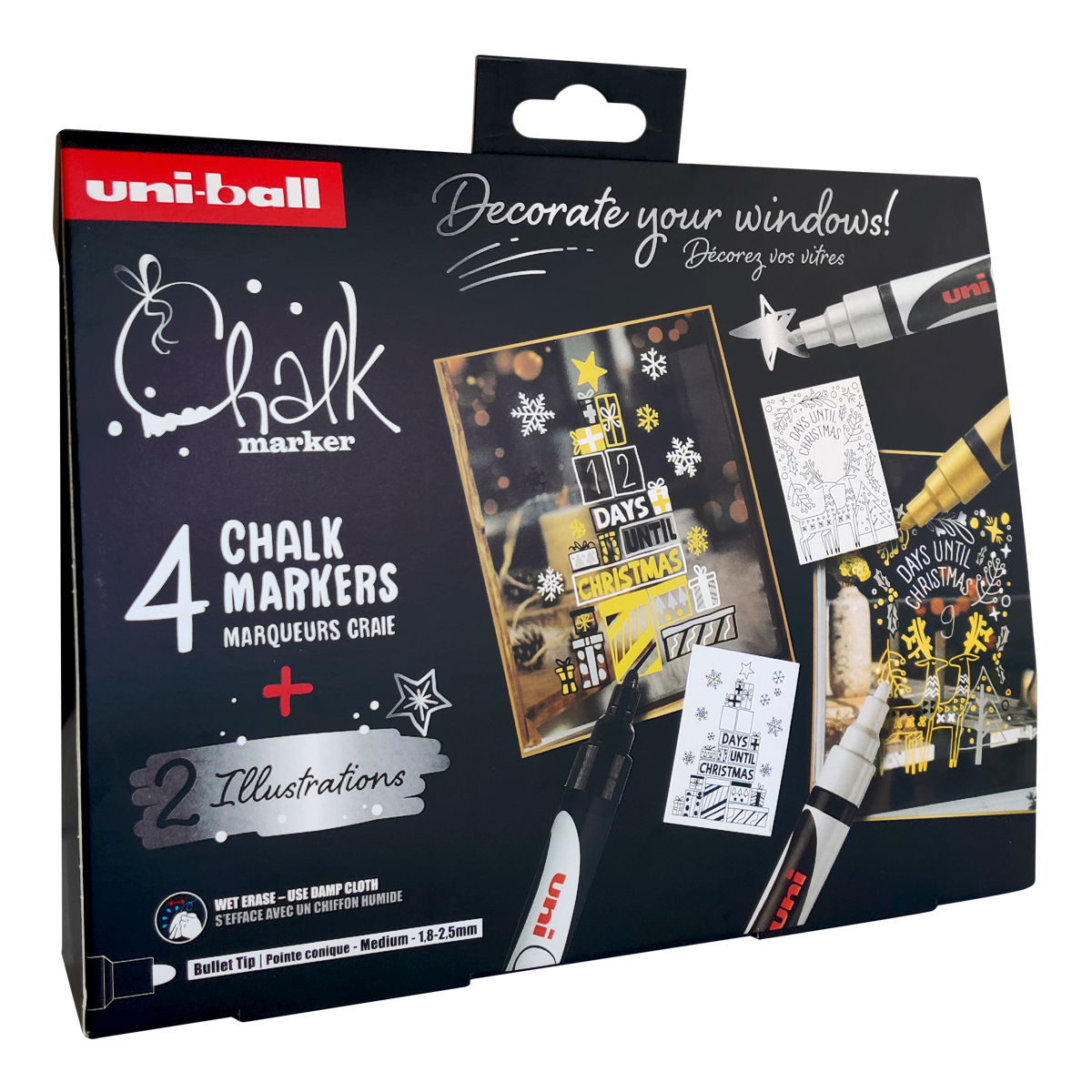 víceúčelový křídový popisovač s bezprašným, nepermanentním inkoustem, snadno se maže vlhkým hadříkem, rychle schne, je vrstvitelý, vhodný na hladké povrchy – sklo, zrcadla, výlohy, tabule, břidlice, odolný vůči dešti a slunečnímu záření, ideální pro dekorace, domácnost, gastro i obchod, šířka stopy: 1,8–2,5 mm, mix zářivých barev: bílá, zlatá, stříbrná, černá, součástí balení: 2 šablony s vánočním motivem, pro více informací naskenuj QR kód na zadní straně krabičky