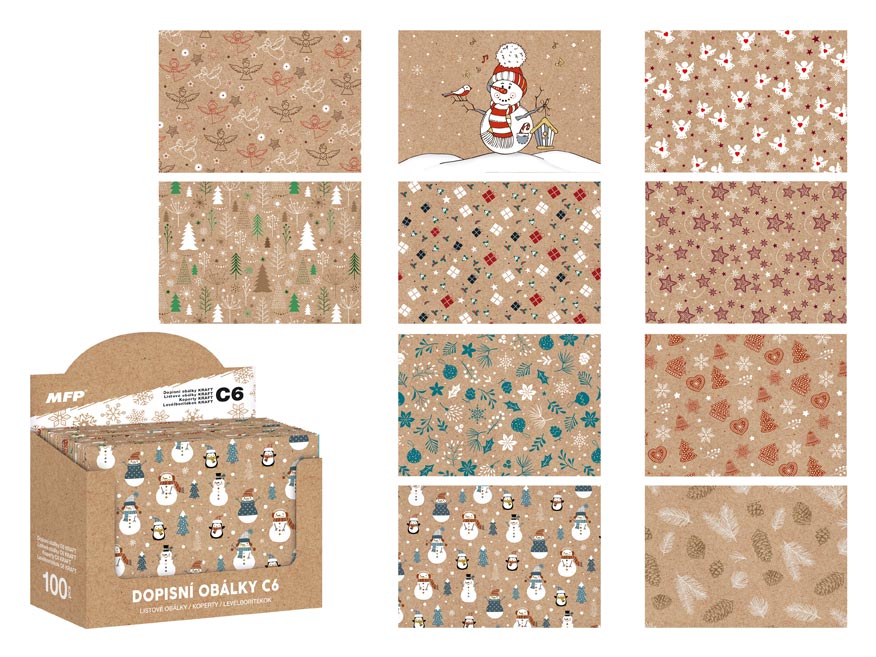 Celoplošně potištěné, vánoční, dopisní obálky C6 (KRAFT). Posíláte rádi dopisy? Pořiďte si u nás tyto krásné dopisní obálky a nezapomeňte si u nás také koupit dopisní papír a propisku!