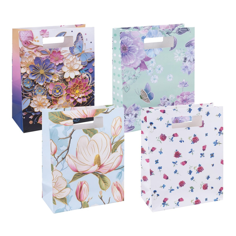 Dárkové tašky s lesklým laminovaným povrchem odolným proti oděru. Nabízí luxusní vzhled, integrovanou rukojeť pro pohodlné držení a stylové květinové motivy. Rozměr: 26 × 32,5 × 10 cm, lesklý laminát 210 g/m², vhodné pro slavnostní příležitosti, odolné provedení, integrovaná rukojeť, mix květinových vzorů